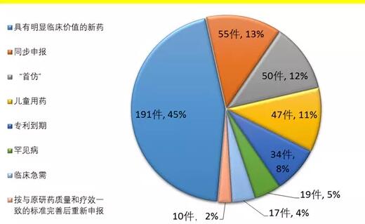 日前,CDE官網(wǎng)發(fā)布2017年度藥品審評(píng)報(bào)告,從文中得知,截至2017年底,藥審中心共將25批423件注冊(cè)申請(qǐng)納入優(yōu)先審評(píng)程序,其中具有明顯臨床價(jià)值的新藥占比最大,共191件,占45%,兒童用藥共47件。納入優(yōu)先審評(píng)程序的注冊(cè)申請(qǐng)情況詳見下圖。