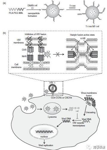 圖(a)NPs由用于藥物包封的可生物降解的PLA核心和用于顆粒穩(wěn)定性的PEG鏈組成;(b)HIV-1和納米顆粒(T1144-NP-14f)運輸?shù)氖疽鈭D和T1144-NP-14f抑制HIV-1感染的推定作用機制