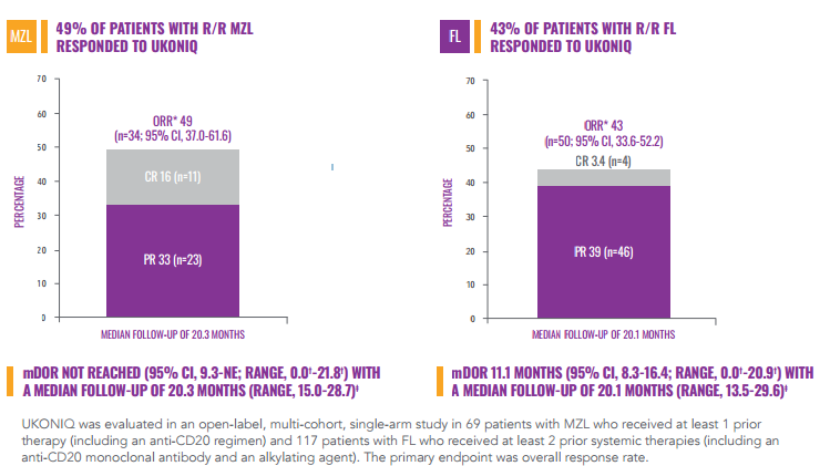 MZL和FL適應(yīng)癥的加速獲批是基于一項開放標(biāo)簽,多中心,雙隊列II期UNITY-NHL研究總緩解率(ORR)數(shù)據(jù)。研究結(jié)果表明,MZL患者的總緩解率(ORR)為49% ,完全緩解率(CR)為16%,中位緩解持續(xù)時間(DOR)尚未達(dá)到。FL患者ORR為43%,CR為3.4%,DOR為11.1個月。