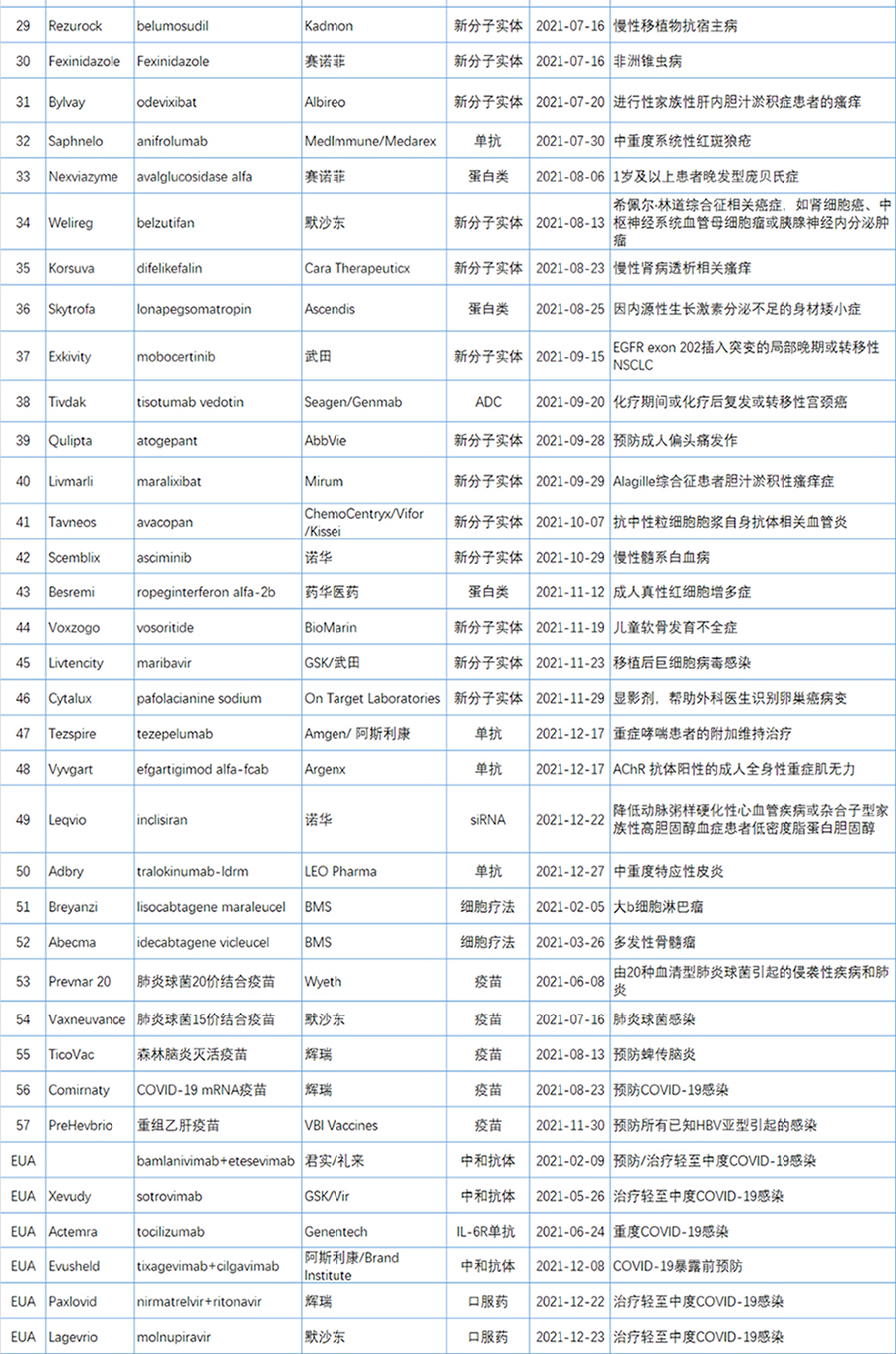 2021年FDA共批準(zhǔn)50款新藥(不包括細(xì)胞療法和疫苗),包括36個新分子實體和14個新生物制品。