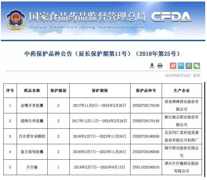 2018年2月24日,國家食藥監(jiān)總局發(fā)布《中藥保護(hù)品種公告(延長保護(hù)期第11號),經(jīng)國家中藥品種保護(hù)審評委員會組織的委員審評、國家食品藥品監(jiān)督管理總局核準(zhǔn)后,批準(zhǔn)以下5個品種延長保護(hù)期。