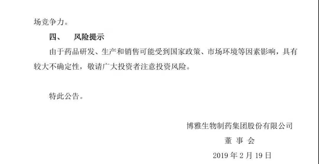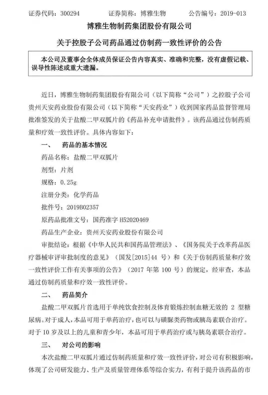 2019年2月19日,博雅生物制藥集團股份有限公司公告其控股子公司貴州天安藥業(yè)股份有限公司(以下簡稱“天安藥業(yè)”)收到國家藥品監(jiān)督管理局批準簽發(fā)的關(guān)于鹽酸二甲雙胍片的《藥品補充申請批件》。該藥品通過仿制藥質(zhì)量和療效一致性評價。