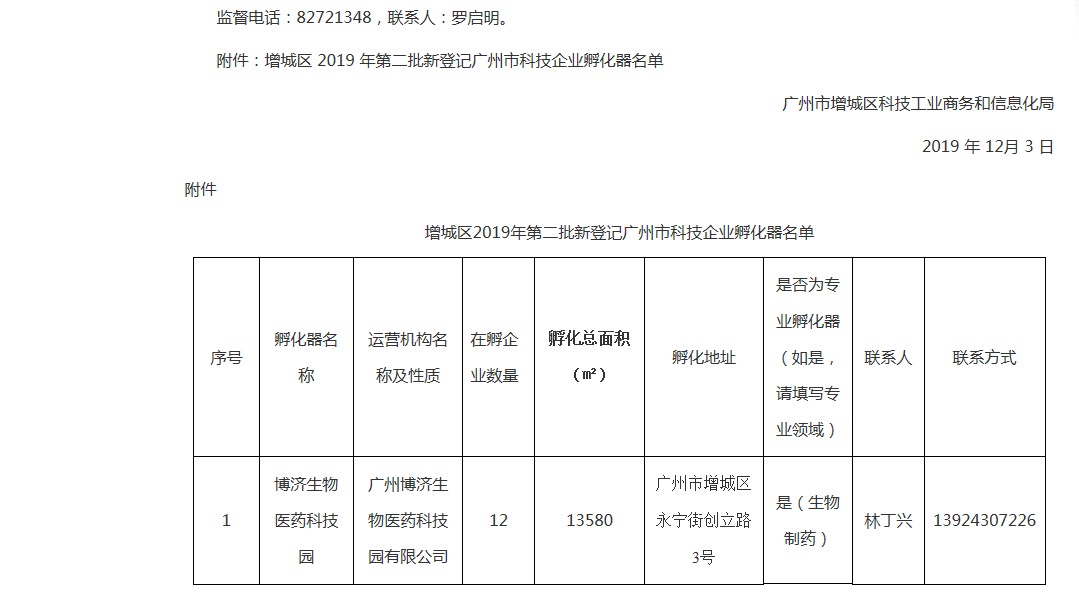 《公示》內(nèi)容顯示,根據(jù)《廣州市科技企業(yè)孵化器和眾創(chuàng)空間管理辦法》(穗科創(chuàng)規(guī)字〔2018〕6號(hào))要求,增城區(qū)科工商信局近期對(duì)申請(qǐng)登記的科技企業(yè)孵化器孵化場地進(jìn)行了現(xiàn)場評(píng)審。博濟(jì)生物醫(yī)藥科技園是本批次唯一通過評(píng)審的園區(qū)。