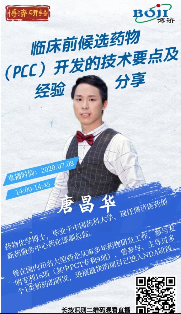 7月8日(本周三),博濟醫(yī)藥創(chuàng)新藥研發(fā)服務中心藥物化學部副總監(jiān)唐昌華將作客“博濟研語”直播間,以《臨床前候選藥物(PCC)開發(fā)的技術要點及經驗分享》為題,向廣大網友分享在創(chuàng)新藥研發(fā)領域的實戰(zhàn)經驗。