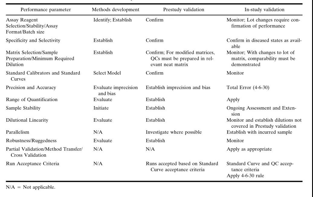 在方法開發(fā)過程中生成的信息應(yīng)記錄在實(shí)驗(yàn)室筆記本或其他可接受的文檔形式中。應(yīng)包括以下評(píng)估信息:關(guān)鍵檢測(cè)試劑的選擇和穩(wěn)定性、測(cè)試格式的選擇(抗體、稀釋液、微孔板、檢測(cè)系統(tǒng)等)、標(biāo)準(zhǔn)曲線模型的選擇、樣本基質(zhì)的選擇、試劑的特異性、樣本制備、初步的穩(wěn)定性研究和方法穩(wěn)健性(robustness)的初步評(píng)估。在方法開發(fā)階段結(jié)束時(shí),應(yīng)生成方法草案或方法驗(yàn)證工作列表(即需要進(jìn)行的實(shí)驗(yàn)),供研究前驗(yàn)證期間參考。