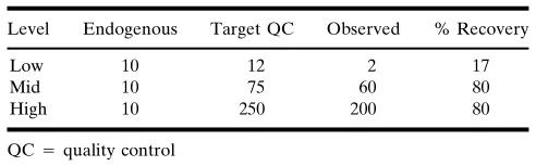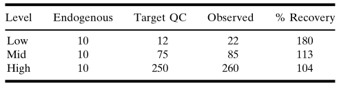 另一種選擇是減去內(nèi)源性濃度,該濃度是用正在驗證的分析方法或一個正交的(orthogonal)分析方法所測定的。這種方法需要分析空白樣品(另外加待測物),這樣就可以減去內(nèi)源量,并計算出外加的標稱量。當內(nèi)源性濃度和外加的待測物濃度不是線性關(guān)系時,就不能用數(shù)學(xué)方法將這兩個濃度相加,因而只能報告測定的(觀察到的)濃度(表IIC)。或者可以在外加待測物之前,剝離空白基質(zhì)中內(nèi)源性蛋白。