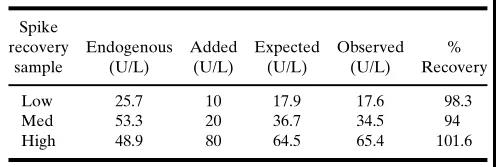 表IIB. 當?shù)润w積的基質(zhì)和QC加在一起時,內(nèi)源性蛋白累加(線性)貢獻的示例。方法:50mL含內(nèi)源性藥物的基質(zhì)(25.7U/L)+ 50mL 標準品10(10U/L)= 期望值17.9U/L(相互以1:2的比例稀釋:12.85U/L+ 5U/L= 17.85U/L)