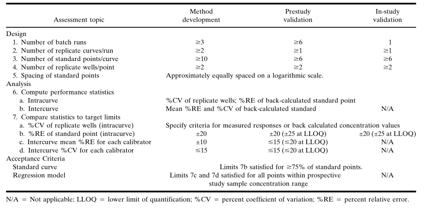 在研究中驗證時,除了在觀察到基質(zhì)干擾時需要額外稀釋樣本外,沒有與樣本制備相關(guān)的接受標準。由于潛在的基質(zhì)干擾而導(dǎo)致重新分析樣品時,應(yīng)當預(yù)先設(shè)定并常規(guī)地應(yīng)用相關(guān)指導(dǎo)原則。在基質(zhì)批次變化的情況下,應(yīng)當制備相同濃度的QC樣品,證實與研究前驗證數(shù)據(jù)的可比性,然后繼續(xù)進行樣本分析。標準校準物(STANDARD CALIBARTOR)和標準曲線將已知數(shù)量表征良好的標準參照(比)物(待測物,analyte)加入到適當?shù)幕|(zhì)中制備標準校準品,在既定的分析條件下生成并得到濃度-響應(yīng)關(guān)系,即標(校)準曲線(standard curve)。根據(jù)這個標(校)準曲線,未知樣品中分析物的濃度可以通過內(nèi)插方法計算。在方法開發(fā)過程中,應(yīng)當建立標準品的濃度和將一條曲線擬合于校準數(shù)據(jù)的回歸模型,此模型需在研究前驗證期間得到確認,并在分析研究樣本時使用。表III匯總了評估標準曲線數(shù)據(jù)設(shè)計和分析回歸模型的建議,將使用表IV中的研究前驗證的標準曲線數(shù)據(jù)說明統(tǒng)計分析的過程。表III. 標準曲線評定標準. (未包括“錨定點”)