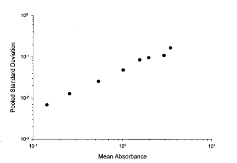 圖2. 表IV所列標準曲線吸光度值的混合運行(batch)內(nèi)標準方差與累積平均響應(yīng)之間的關(guān)系。每個點代表一個濃度點的平均值和通過方差分析(ANOVA)計算的標準方差。在高吸光度水平下,變異性較大;這表明,在擬合標準曲線時,加權(quán)可能是適當?shù)摹?/span>