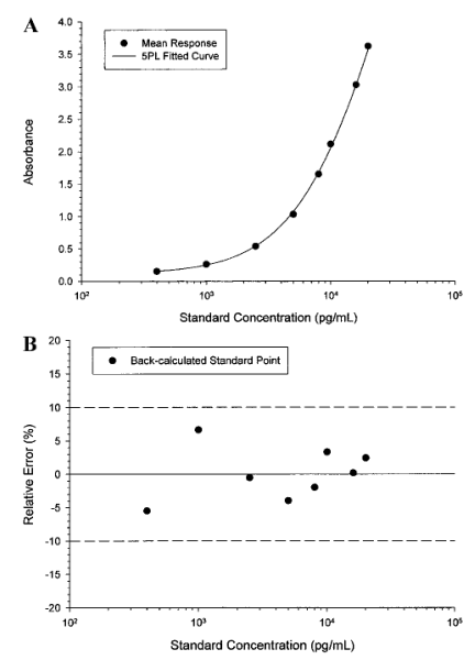 由于標準點濃度在方法驗證開始后不應(yīng)改變,因此在方法開發(fā)過程中應(yīng)包括更多的標準點(standard point)和重復(fù)點(replicates),以便盡早地詳細研究濃度-響應(yīng)關(guān)系,盡可能地實現(xiàn)為回歸模型提供可靠的評估。標準參照(比)物濃度點的范圍應(yīng)包括稀釋后研究樣品的濃度,并在對數(shù)刻度上近似均勻地間隔。建議至少有10個非零標準濃度點(復(fù)孔,duplicate)用于濃度-響應(yīng)關(guān)系,用于其早期特征的描述。該濃度-響應(yīng)關(guān)系可以使用4/5參數(shù)的logistic函數(shù)(4/5PL 模型)來描述。標準曲線應(yīng)擬合校準濃度點的平均響應(yīng)值(圖1A)。圖1. A.5參數(shù)logistic (5PL)加權(quán)非線性最小二乘法回歸擬合的曲線。平均響應(yīng)是表IV.中列出了第6個運行(batch)的重復(fù)結(jié)果。B.圖1A中回算標準點濃度的百分比相對誤差。所有數(shù)值都在標稱值的10%以內(nèi)。