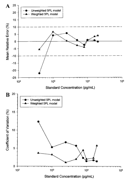一個可被接受的校準模型,其曲線的累積回算數(shù)值對于在預(yù)期的定量范圍內(nèi)的所有濃度,應(yīng)具有10%的絕對平均RE值和15%的變異系數(shù)(CV)(參見表V)。在校準品濃度范圍中,如果平均RE存在一個趨勢,即回算濃度始終一致地高于或低于標稱濃度,則是擬合失敗的證據(jù),會使該模型失效。擬合失敗可能是由于選擇了不合適的平均值函數(shù)(例如,在濃度-響應(yīng)曲線不對稱時使用了4PL函數(shù))或加權(quán)過程不當。例如,加權(quán)使得擬合的曲線與表IV中的數(shù)據(jù)更相符,其證據(jù)是:在較低濃度部分,降低了平均RE(圖3A)和CV(圖3B);而在較高濃度部分,準確性或精密度的損失極小。圖3. A.未加權(quán)和加權(quán)五參數(shù)logistic(5PL)回歸曲線回算濃度的累積平均相對誤差百分比的比較與表IV的吸光度數(shù)據(jù)相吻合。加權(quán)模型的結(jié)果在整個標準濃度范圍是可以接受的,而非加權(quán)模型在低于1000pg/mL濃度是不可接受的。B.未加權(quán)和加權(quán)五參數(shù)logistic (5PL)回歸曲線回算濃度變化的累積百分比系數(shù)的比較與表IV的吸光度數(shù)據(jù)相吻合。加權(quán)回歸模型的計算值總結(jié)如下在表V中。加權(quán)模型在較低濃度水平下得到了較小的批間變化系數(shù)。