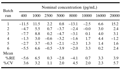 在建立校準模型時,建議分析至少3個獨立運行(batch/run)的標準曲線濃度-響應(yīng)數(shù)據(jù),每次運行應(yīng)包含兩條標準曲線,以便評估運行內(nèi)標準曲線的可重復(fù)性。模型的適宜性取決于標準點回算濃度的RE,計算一個濃度點的RE如下:從回算濃度中減去標稱濃度并將其差值除以標稱濃度。通常,對于曲線內(nèi)的大多數(shù)標準點回算濃度的絕對RE應(yīng)為20%。例如,根據(jù)加權(quán)5PL回歸曲線擬合平均光吸收值(表IV中第6個運行的數(shù)據(jù))所得出的模型,回算濃度的絕對REs都是<10%(表V和圖1B)。同樣,其他5個運行的絕對REs也始終一致地<10%(第1個運行中的幾個點除外)。