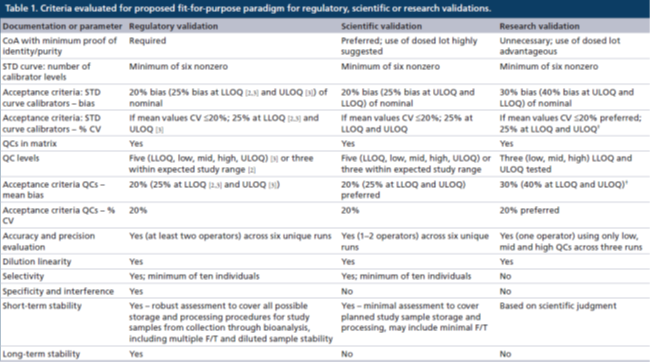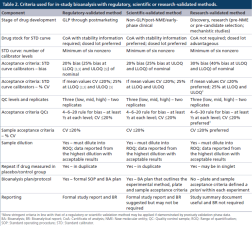 表2. 對于經(jīng)監(jiān)管級、科學級或研究級驗證的分析方法在研究中樣本分析的接受標準