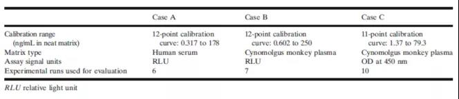 用于評(píng)估各自PK分析運(yùn)行的校準(zhǔn)曲線(xiàn)數(shù)據(jù)如圖2所示。在所有3個(gè)案例研究中都觀察到了典型的非線(xiàn)性的濃度-響應(yīng)曲線(xiàn)。