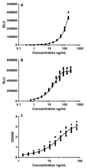 圖2. 3個(gè)案例研究中的校準(zhǔn)曲線(xiàn):案例 A(a),案例 B(b) 和案例 C(c)。該圖展示了3條標(biāo)準(zhǔn)曲線(xiàn)的形狀,代表了在LBA測(cè)試中通常觀察到的典型非線(xiàn)性響應(yīng)。X軸代表校準(zhǔn)點(diǎn)濃度的對(duì)數(shù),Y軸代表響應(yīng)讀數(shù):案例A和B是相對(duì)光單位(RLU),案例C是450 nM 光學(xué)密度(OD 450)。