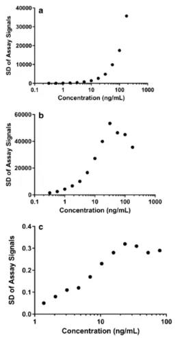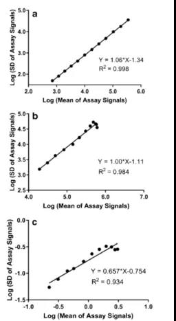 圖3. 案例A(a)、案例B(b)和案例C(c)的異方差性概況。X軸代表校準(zhǔn)點(diǎn)濃度的對(duì)數(shù),Y軸代表實(shí)驗(yàn)運(yùn)行中測(cè)試信號(hào)的SD。