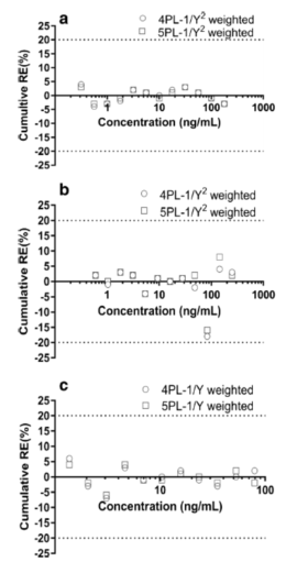 圖5. 準(zhǔn)確度行為圖。對(duì)案例A(a)、案例B(b)和案例C(c)中校準(zhǔn)曲線(xiàn)的加權(quán)(1/Y或者1/Y2)擬合模型進(jìn)行了比較。比較模型:4PL vs 5PL;比較參數(shù):回算濃度的累積相對(duì)誤差(%RE)。兩條虛線(xiàn)之間的區(qū)域是可接受范圍(± 20%)。(○)代表4PL加權(quán)擬合,(□)代表5PL加權(quán)擬合。