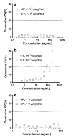 圖6. 精密度行為圖:案例A(a),案例B(b)和案例C(c)比較模型:加權(quán)4PL vs 加權(quán)5PL;比較參數(shù):回算濃度的 %CV。虛線(xiàn)和X軸之間的區(qū)域是可接受范圍(± 20%)。(○)代表 4PL 加權(quán)擬合,(□)代表 5PL 加權(quán)擬合。
