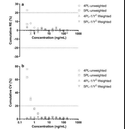 為了確定可接受的曲線(xiàn)擬合模型,應(yīng)評(píng)估擬合曲線(xiàn)的4PL與5PL模型(不加權(quán)和加權(quán))回算濃度的累積 %RE和累積 %CV。應(yīng)當(dāng)選擇,在可接受的范圍內(nèi),具有較低的%CV和%RE,校準(zhǔn)點(diǎn)數(shù)量較多的回歸模型。如果兩者都是相當(dāng)?shù)?,則選擇加權(quán)4PL模型作為最終曲線(xiàn)擬合模型,進(jìn)行方法驗(yàn)證和樣本分析。根據(jù) FDA 指南,應(yīng)當(dāng)選擇假設(shè)最少的模型,即選擇最簡(jiǎn)單的模型。根據(jù)精密度和準(zhǔn)確度數(shù)據(jù),在所有3個(gè)案例中,4PL都是基于這些標(biāo)準(zhǔn)的最佳回歸模型。