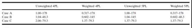 在案例研究 A、B、C 中,線(xiàn)性回歸的斜率分別為 1.06,1.00 和 0.657; 因此,權(quán)重因子分別估計(jì)為2,2和1。在案例A和B中,權(quán)重因子為2; 因此,在校準(zhǔn)曲線(xiàn)回歸模型(4PL或5PL)中,使用了權(quán)重函數(shù)1/Y2。對(duì)于案例C,權(quán)重系數(shù)為 1; 因此,權(quán)重函數(shù)為 1/Y。