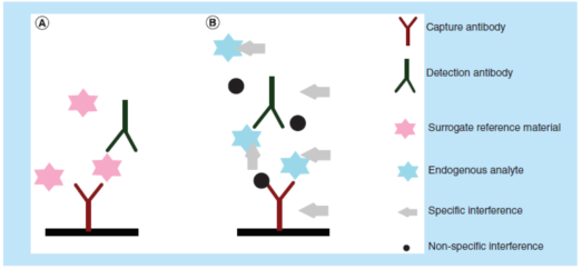 LBA定量測(cè)定存在于生物基質(zhì)中的待測(cè)物,無(wú)需事先萃取。在理想情況下,捕獲/檢測(cè)試劑應(yīng)結(jié)合(并且僅結(jié)合)待測(cè)物,保證其不會(huì)與任何其它的蛋白發(fā)生交叉反應(yīng)。不幸的是,情況往往并非如此。在現(xiàn)實(shí)世界中,生物基質(zhì)中的內(nèi)源性蛋白經(jīng)常阻斷試劑與待測(cè)物的結(jié)合。內(nèi)源基質(zhì)干擾物可以特異性地或非特異性地結(jié)合捕獲/檢測(cè)試劑或待測(cè)物,使得測(cè)試信號(hào)增加或減少。