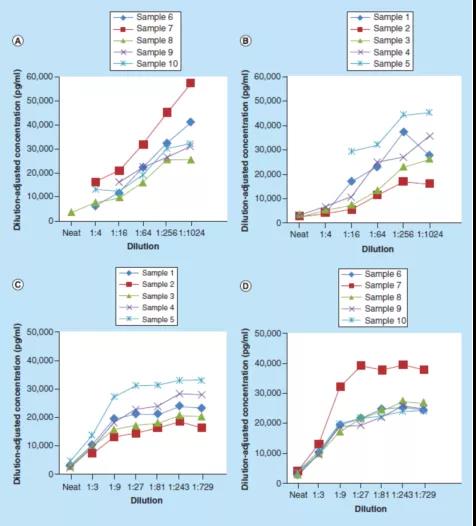 這些數(shù)據(jù)表明,使用1% BSA PBS緩沖液作為替代基質(zhì)時(shí),大多數(shù)受試者的樣本沒(méi)有達(dá)到平行性(圖2A-B)。然而,使用1% BSA PBS加0.50%(v/v)Triton X-100緩沖液在1:27或更大稀釋倍數(shù)時(shí),則顯示了平行性(圖2C-D)。