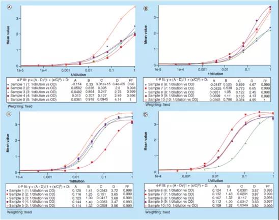 對(duì)于LBA定量方法,測(cè)試信號(hào)與濃度/稀釋倍數(shù)之間的相關(guān)性通常不是線性的。因此,線性關(guān)系圖不能準(zhǔn)確反映樣本之間的平行性。建議使用加權(quán)或無(wú)加權(quán)的4或5參數(shù)logistic回歸(4PL或5PL)模型,以實(shí)現(xiàn)最小方差的最佳曲線擬合。從圖中直接可以看到每個(gè)樣本稀釋曲線的平行關(guān)系,并可以評(píng)價(jià)樣本之間的平行性。一個(gè)局限是不清楚如何為"原始測(cè)試信號(hào)"方法設(shè)置固定的接受標(biāo)準(zhǔn)。每個(gè)樣本的"B"參數(shù)("B"表示4PL和5PL的希爾曲線斜率)可用于評(píng)估方法平行性。也可以進(jìn)一步評(píng)估并應(yīng)用更多的統(tǒng)計(jì)方法,以便更好地解釋數(shù)據(jù)。