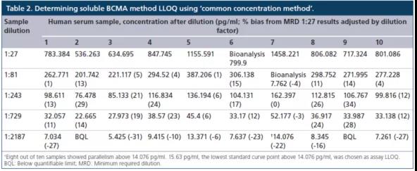常用稀釋方法(common dilution method)是將在最大稀釋倍數(shù)時(shí)給出平行響應(yīng)的所有單個(gè)樣本中觀察到的最高濃度定為L(zhǎng)LOQ。但使用該種辦法時(shí)存在一個(gè)不足,就是當(dāng)至少一個(gè)樣本的內(nèi)源性濃度明顯高于其他樣品時(shí),確定的LLOQ將高于真正的LLOQ。而另一種方法,共同濃度方法(common concentration method)是將所有樣品都表現(xiàn)出平行性的最高濃度確定為L(zhǎng)LOQ。換言之,任何高于確定LLOQ濃度的樣本,都通過(guò)平行實(shí)驗(yàn)表現(xiàn)出相對(duì)的準(zhǔn)確度。對(duì)sBCMA案例研究的數(shù)據(jù),使用了"共同濃度方法"(表2)。