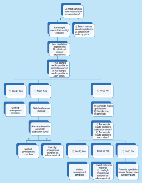 簡(jiǎn)而言之,需要確認(rèn)參考照(比)物料和關(guān)鍵試劑的質(zhì)量和批次間的變異性,也需要確認(rèn)或重新建立測(cè)試方法的LLOQ和MRD,也可能需要優(yōu)化緩沖液和稀釋劑,并且在有必要時(shí)優(yōu)化檢測(cè)步驟。而評(píng)估上述所有內(nèi)容最有效的方法則是通過(guò)平行性實(shí)驗(yàn)。因此,強(qiáng)烈建議在方法開(kāi)發(fā)的早期階段進(jìn)行平行性實(shí)驗(yàn)。如果在研究期間觀察到非平行性,則建議使用相同的故障排除路線(見(jiàn)圖5)。