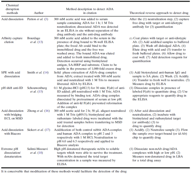 表1. 用于破壞ADA-藥物復(fù)合物,以提高ADA檢測靈敏度的方法
