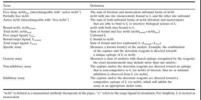 生物體液中游離、部分游離(partially free,也稱為部分結(jié)合/ partially bound),結(jié)合(bound)全部(total)mAb和L的術(shù)語。對(duì)于mAb,將其“游離/free”部分實(shí)用性地定義為表現(xiàn)出與其未結(jié)合形式(unbound forms)相等同的生物活性的形式。由于mAbs的二價(jià)性,游離mAb既包括未結(jié)合(unbound)mAb,也包括部分結(jié)合mAbs(即一價(jià)結(jié)合的/monovalently bound),這些形式通常是使用未結(jié)合的參考標(biāo)準(zhǔn)物(unbound reference standards)來定量的。總體mAb將是完全結(jié)合形式(fully bound)、部分結(jié)合形式(partially bound)和非結(jié)合形式(unbound)的總和。