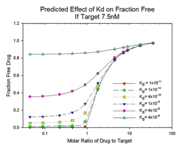 圖1. 在一定的mAb/L摩爾比范圍內(nèi),mAb-L親和力對(duì) mAbfree的影響。將L的濃度固定為常數(shù),用于模擬計(jì)算 mAbfree。為了便于解釋,本例中的摩爾比是基于假設(shè)每摩爾藥物有一個(gè)結(jié)合位點(diǎn);對(duì)于mAb,每摩爾藥物有兩個(gè)結(jié)合位點(diǎn)。