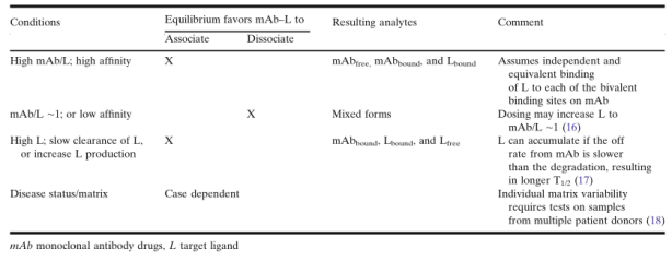 在含有這些不同形式的混合物的樣本中,而且當(dāng)很難控制mAb和/或L的特定形式的平衡動(dòng)力學(xué)時(shí),將平衡驅(qū)動(dòng)到主要以mAb和L的游離或結(jié)合(總體)的形式存在,然后進(jìn)行定量分析的價(jià)值較大。此外,使用分離步驟來分離游離的和結(jié)合的形式,并定量特定的形式,以獲得藥物開發(fā)的每個(gè)階段所需的PK或PD信息。許多LBA檢測平臺(tái)和條件都足夠靈活,可以完成這項(xiàng)工作。