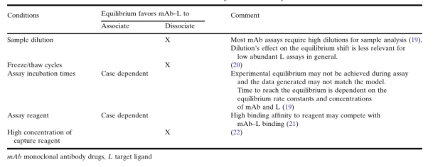 除了考慮給藥后mAb-L結(jié)合的體內(nèi)動(dòng)力學(xué)外,離體狀況(ex vivo conditions)如樣品采集、儲(chǔ)存、運(yùn)輸和樣本分析等可能使樣本的平衡狀態(tài)與體內(nèi)(in vivo)狀態(tài)大不相同。表5列出了一些可能影響結(jié)合或解離平衡動(dòng)力學(xué)的狀況。
