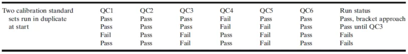 總體而言,如果40%或更多個(gè)QC失敗,則必須重新分析,在可接受的最后一組QC之后的,所有樣本。只有在運(yùn)行開(kāi)始時(shí)的一組QC都通過(guò)了的情況下,才能接受第一組樣本的分析結(jié)果。如果QC的成功和失敗是零星的(sporadic),則整個(gè)樣本分析運(yùn)行失敗,必須進(jìn)行原因調(diào)查。RIA使用類(lèi)似的方法,系列式地分析一組試管。