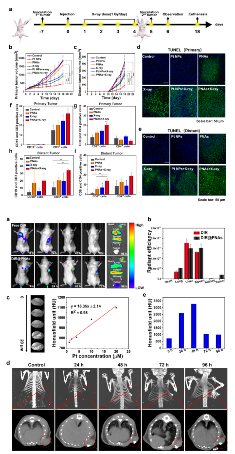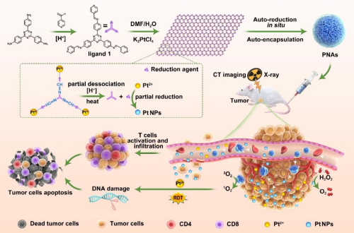 這種納米藥物不僅可在無(wú)任何表面修飾的情況下實(shí)現(xiàn)腫瘤富集和放療增敏作用,高效改善放射療法中的乏氧及局部射線沉積不足等造成的療效欠缺的問(wèn)題,還能響應(yīng)腫瘤微環(huán)境進(jìn)一步解離釋放鉑離子,發(fā)揮放射動(dòng)力學(xué)和激活抗腫瘤免疫反應(yīng)協(xié)同功能。與此同時(shí),這種納米藥物還具備用于腫瘤診斷的計(jì)算機(jī)斷層掃描成像的潛力,是一種極具吸引力的輻射驅(qū)動(dòng)的腫瘤診療一體化納米平臺(tái)。