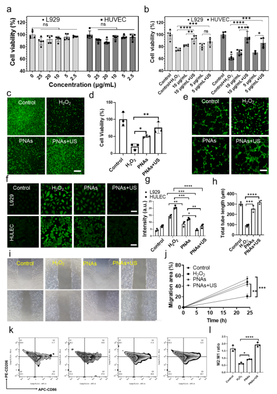 在體外,作者通過(guò)計(jì)算酶動(dòng)力學(xué)參數(shù)及高分辨質(zhì)譜技術(shù)評(píng)估了鉑納米粒子聚集體催化分解H2O2、生成GSH的能力。進(jìn)一步在體外細(xì)胞炎癥模型中驗(yàn)證了鉑納米粒子聚集體在超聲介導(dǎo)下改善成纖維細(xì)胞增殖、內(nèi)皮細(xì)胞分化、角質(zhì)形成細(xì)胞遷移、ROS清除、巨噬細(xì)胞極化等多種效應(yīng)。