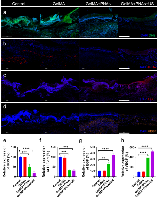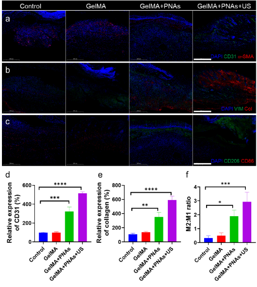 最后在小鼠糖尿病傷口模型中開(kāi)展了傷口愈合實(shí)驗(yàn)及機(jī)制的研究。實(shí)驗(yàn)結(jié)果表明:將鉑納米粒子聚集體與GelMA凝膠混合后噴涂在傷口處,僅進(jìn)行一次超聲介導(dǎo)就能顯著的增加傷口愈合的速度和效果。一系列免疫熒光切片的結(jié)果進(jìn)一步驗(yàn)證了:超聲介導(dǎo)下的鉑納米粒子聚集體是通過(guò)下調(diào)ROS水平和炎癥因子,改善細(xì)胞增殖和遷移能力,同時(shí)調(diào)節(jié)巨噬細(xì)胞表型等方式實(shí)現(xiàn)有效的傷口愈合。這種既能從表觀下調(diào)炎癥因子水平又能調(diào)節(jié)細(xì)胞穩(wěn)態(tài)環(huán)境的方式,將為難愈傷口管理方法提供一種的全新策略。